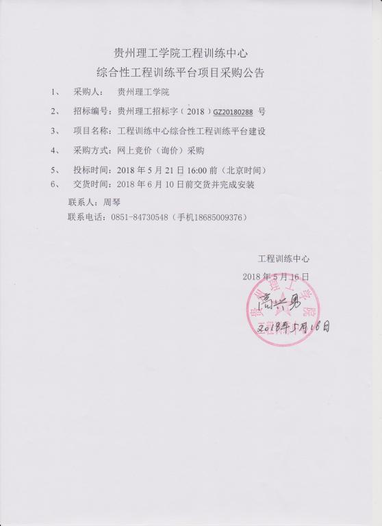 贵州理工学院工程训练中心综合性工程训练平台项目采购公告