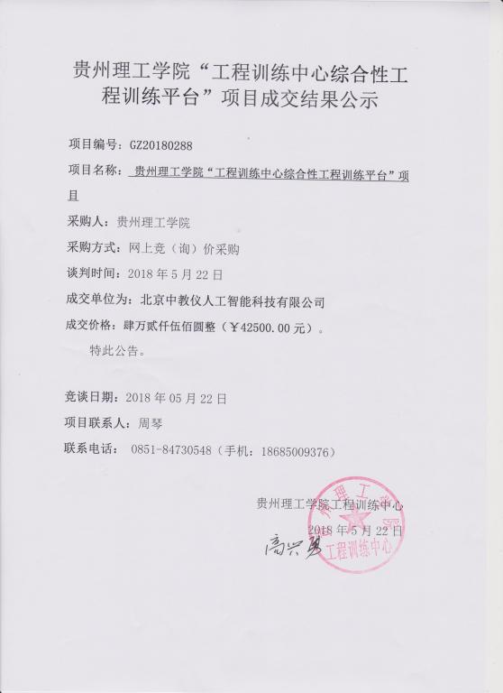 贵州理工学院“工程训练中心综合性工程训练平台”项目成交结果公示