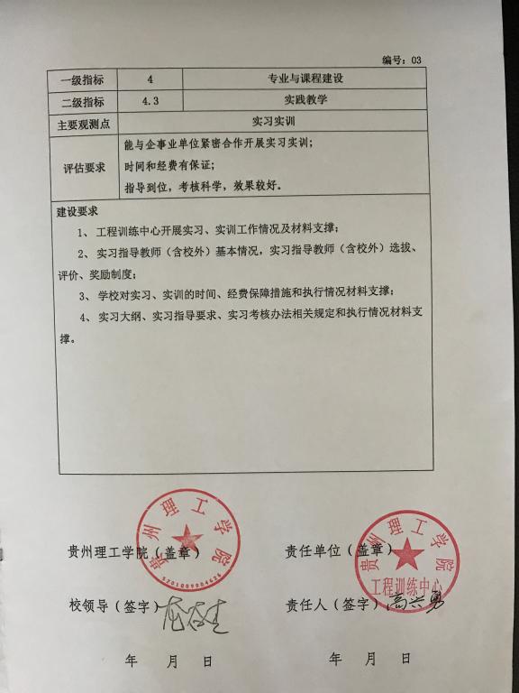 工程训练中心副主任高兴勇与学校签订《贵州理工学院合格评估建设任务书》,中心分管教学的副主任钟晓锋与教研室负责人及全体教师签订《工程训练中心合格评估建设任务书》。明确评估具体工作任务,落实责任。